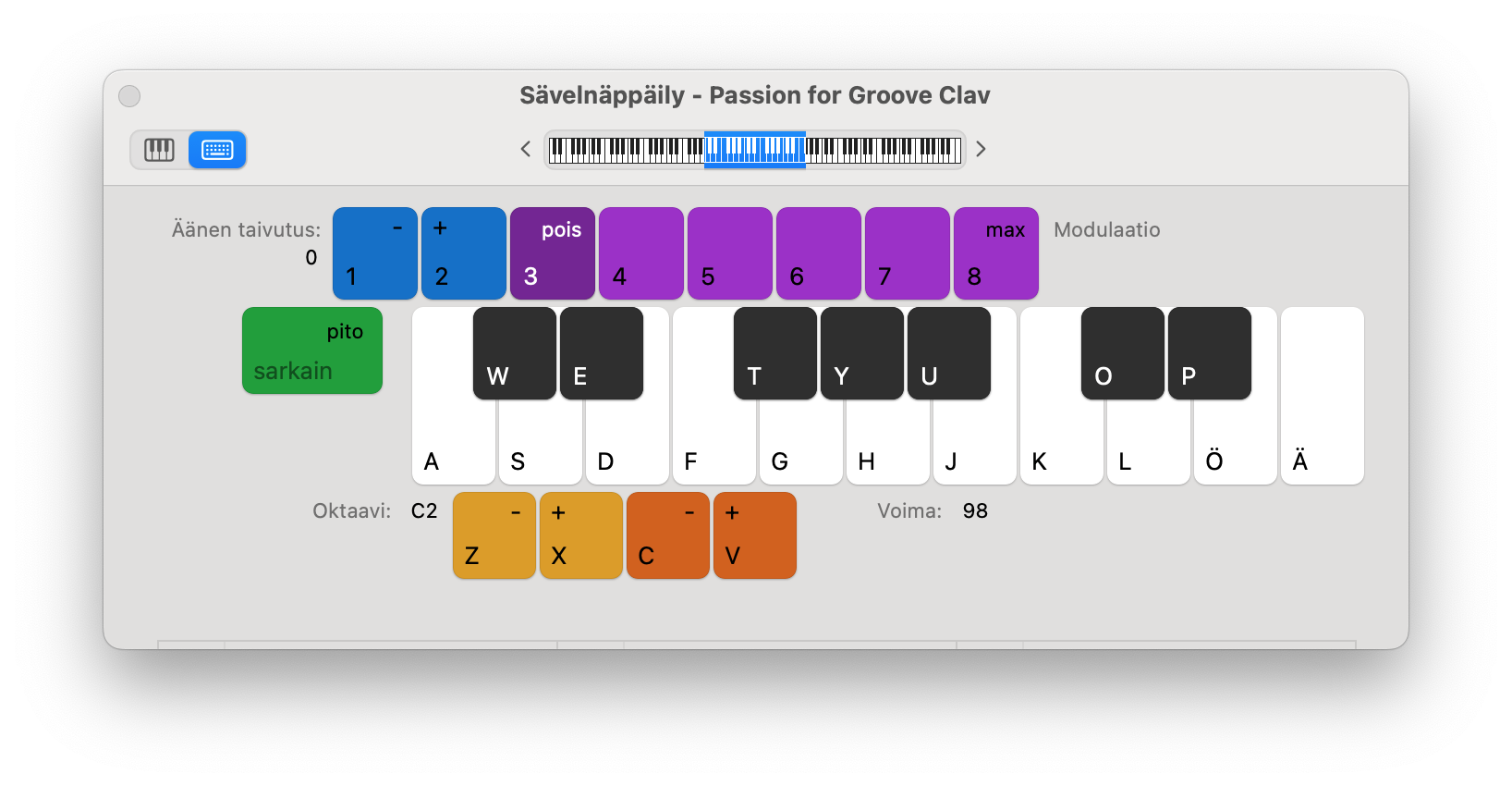 Sävelnäppäily: Jos et omista MIDI-koskettimia, voit avata GarageBandin sävelnäppäilyn (⌘ + K) ja soittaa tietokoneen kirjaimilla ja numeroilla.