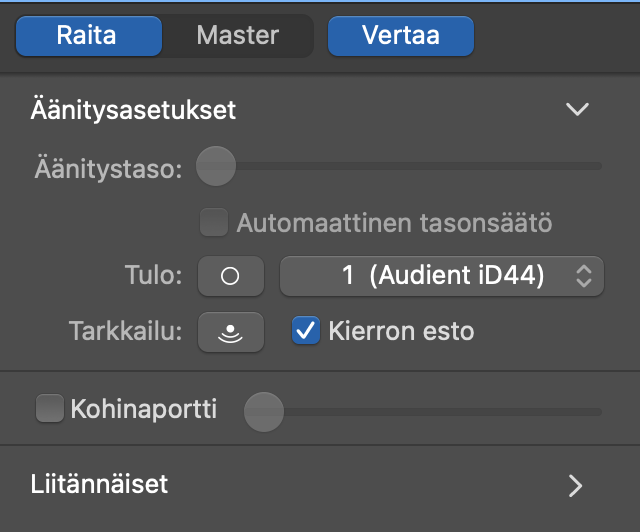 Tulon tarkkailu: Kytke tulon tarkkailu (input monitoring) päälle, jos haluat kuulla itsesi kuulokkeista reaaliajassa. Varo kiertoa, jos käytät kaiuttimia.