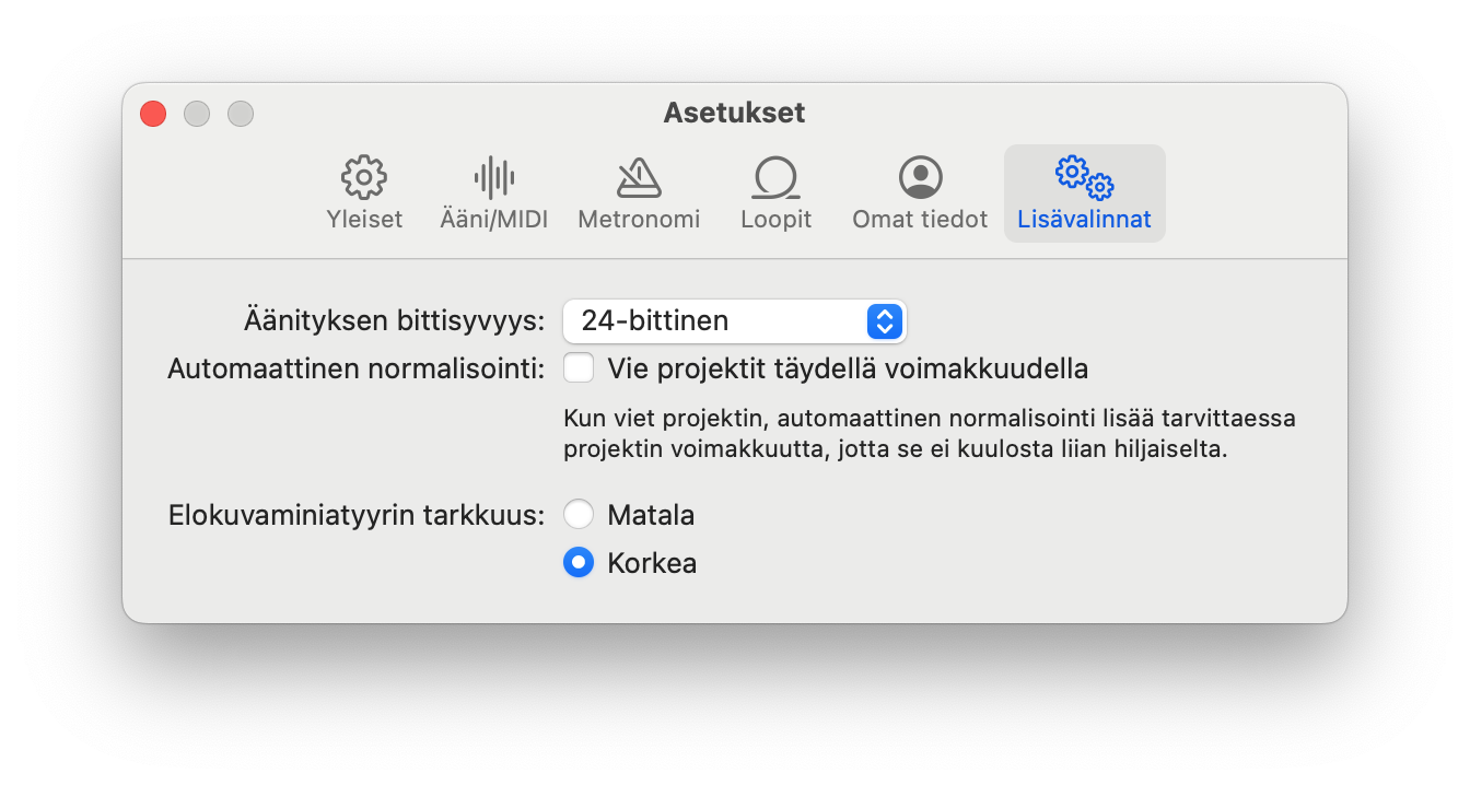 GarageBand äänittää aina 44,1 kHz:n näytetaajuudella, eikä näytetaajuutta voi muuttaa. Äänityksen bittisyvyys on valittavissa asetuksista 16-bittisen ja 32-bittisen liukulukuresoluution välillä. Päästäksesi käsiksi näihin asetuksiin valitse ylhäältä valikoista GarageBand -> Asetukset -> Lisävalinnat.