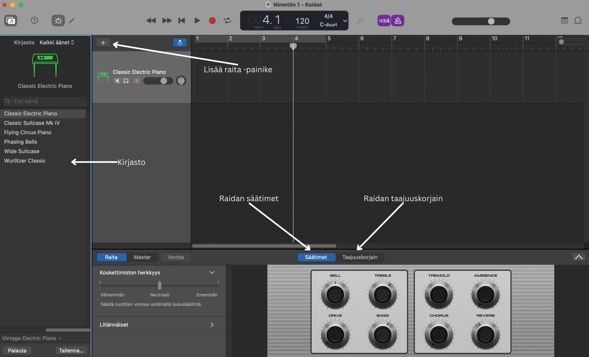Kirjasto-painike avaa vasemmalle instrumenttikirjaston ja Säätimet-painike alas raidan säätimet (Smart Controls) tai editorin riippuen siitä kumpaa painiketta käyttää. Projektiin voi lisätä raitoja Lisää raita –painikkeella.