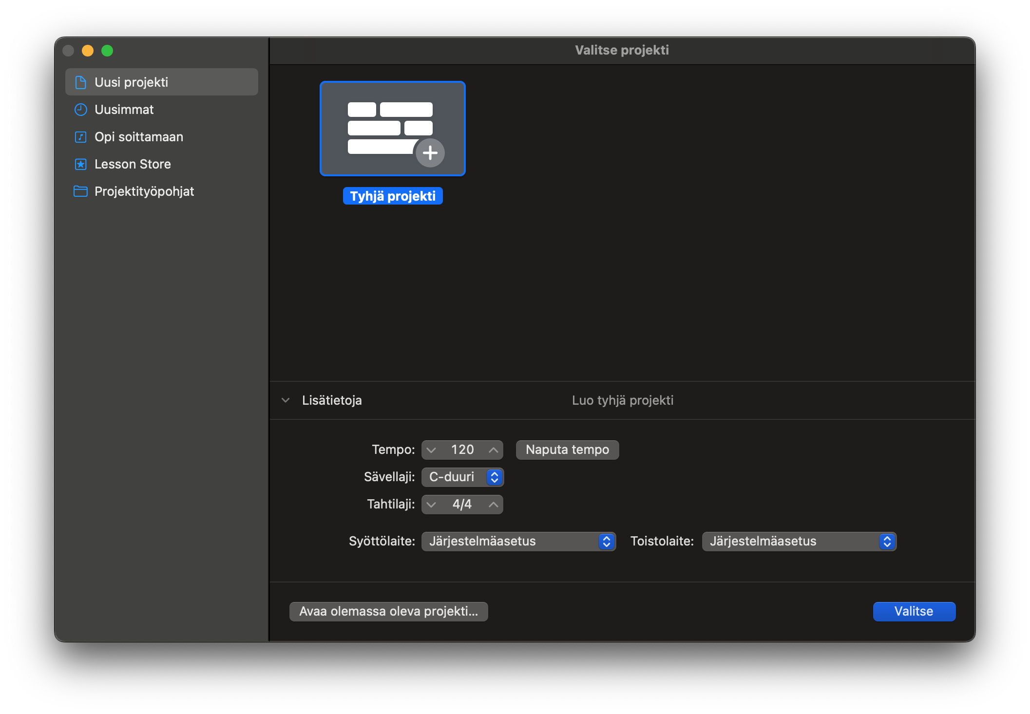 Vasemmalla olevasta sarakkeesta voi valita uuden projektin. Aiemmin aloitetut ja viimeisimmin käytetyt projektit ovat nopeasti avattavissa Uusimmat –valikon takaa. Opi soittamaan ja Lesson Store –valikoiden kautta voi hankkia ja katsoa instrumenttien soittamiseen liittyvää opetusmateriaalia. Projektityöpohjat tarjoaa valmiiksi luotuja työpohjia, joista lähteä työskentelemään.